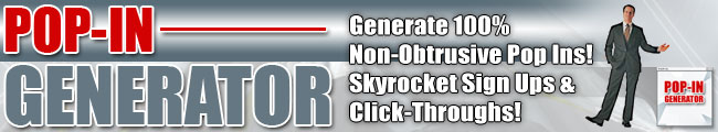 Skyrocket Sales, Conversions, Sign-Ups Pop-In Generator is a simple, effective and innovative software breakthrough! Important: Pop-Ins Are Not really Pop Ups! From: Larry McCann Let me ask you the most important question about Pop Up windows, ok? We all know that pop up windows are effective in increasing opt-in email list(s), conversions and sales, right? If that's the case, why do we have a zillion pop up blockers and why are pop up windows hated so much? I'm asking this question because if we can know exactly why and we do something about it, we'd sure have a new powerful internet marketing tool that is more effective and powerful than pop up windows! The answer in one word is... obtrusiveness. Obtrusiveness is defined as "noticeable or prominent in an unwelcome or intrusive way." Sounds like a definition of pop up windows, doesn't it! :) Pop up windows are hated because they are obtrusive and disturbing.